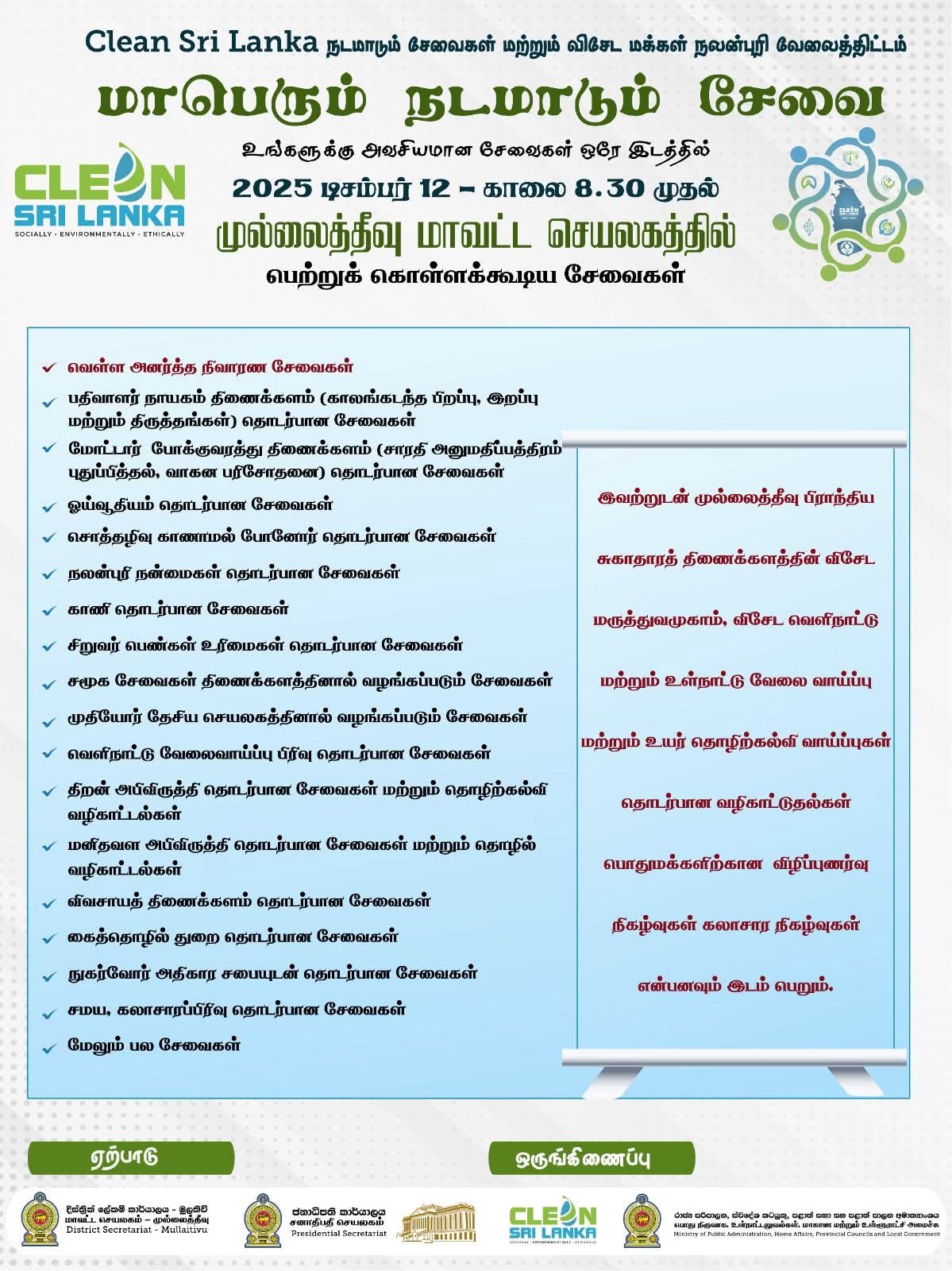 உள்நாட்டலுவல்கள், மாகாண சபைகள் மற்றும் உள்ளூராட்சி அமைச்சு, Clean Sri Lanka செயலகம் மற்றும் மாவட்ட செயலகம் முல்லைத்தீவு என்பன “க்ளீன் ஸ்ரீ லங்கா – ஒருங்கிணைந்த மற்றும் நிலைத்த நாடு” என்ற தேசிய திட்டத்திற்கு அமைவாக நடமாடும் சேவை மற்றும் விசேட மக்கள் நலன்புரி வேலைத்திட்டம் *2025 டிசம்பர் 12 வெள்ளிக்கிழமை காலை 8.30 முதல் முல்லைத்தீவு மாவட்டச் செயலகத்தில் இடம் பெறவுள்ளது.*