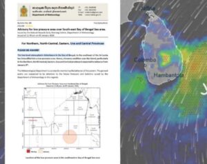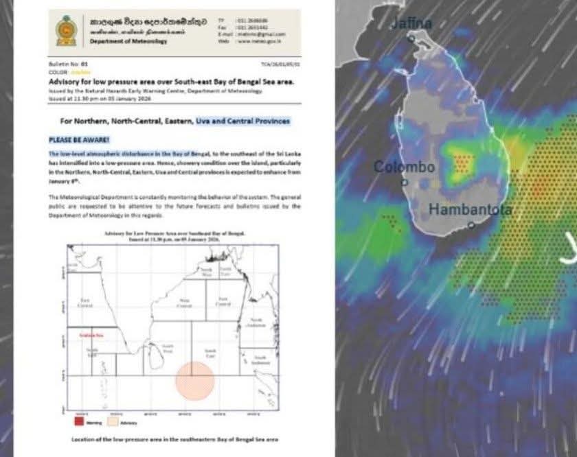 வங்கக்கடலில் நிலைகொண்டுள்ள தாழ்வு மண்டலம் ஜனவரி 8 முதல் மழை அதிகரிக்க வாய்ப்பு. இலங்கைக்கு தென்கிழக்கே வங்கக்கடலில் நிலைகொண்டுள்ள வளிமண்டலக் கீழடுக்கு சுழற்சியானது தற்போது குறைந்த அழுத்தப் பிரதேசமாக (Low-Pressure Area) வலுவடைந்துள்ளதாக வானிலை ஆய்வு மையம் தெரிவித்துள்ளது.