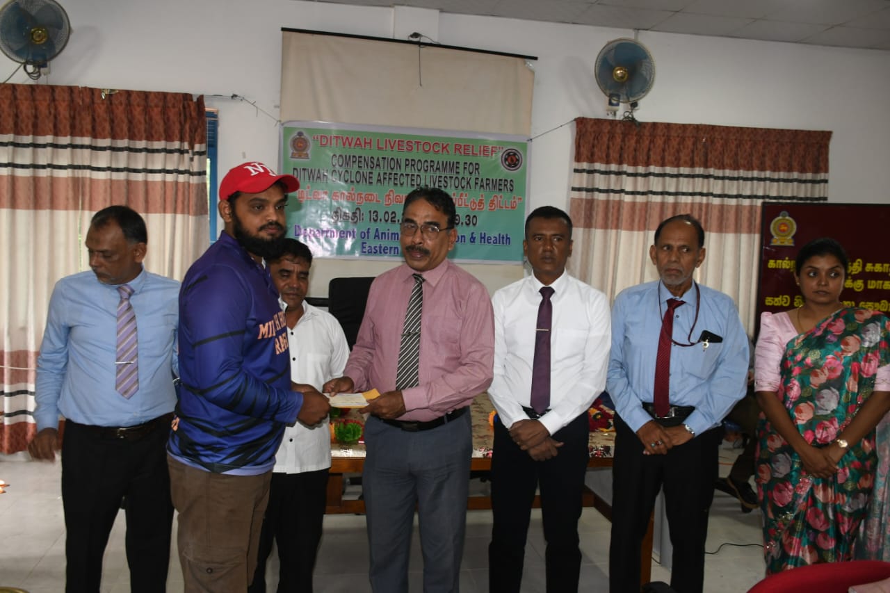 மட்டக்களப்பு மாவட்டத்தில் தித்வா புயலினால் சிக்கி இறந்த கால்நடைகளுக்கான இழப்பீடு வழங்கும் நிகழ்வு மட்டக்களப்பு மாவட்ட பிரதிப்பணிப்பாளர் எம்.ஏ. ஹாதி அவர்களின் தலைமையில் கால்நடை உற்பத்தி சுகாதார திணைக்கள மாநாட்டு மண்டபத்தில் இன்று (13) இடம் பெற்றன. இந் நிகழ்வில் மட்டக்களப்பு மாவட்ட அரசாங்க அதிபர் ஜே.எஸ். அருள்ராஜ், கிழக்கு மாகாண கால்நடை உற்பத்தி சுகாதார திணைக்களத்தின் மாகாணப் பணிப்பாளர் வைத்தியர் எம்.ஏ.எம். சுல்பிஹார் அபூபக்கர் கலந்து கொண்டனர்.