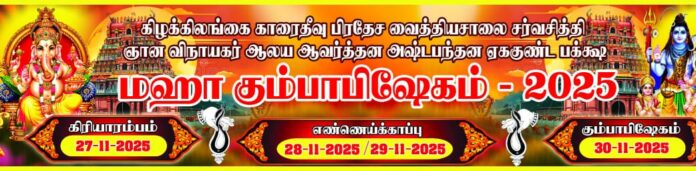 கிழக்கிலங்கை காரைதீவு பிரதேச வைத்தியசாலையில் புதிதாக நிருமாணிக்கப்பட்ட சர்வசித்தி ஞான விநாயகர் ஆலய ஆவர்த்தன அஷ்டபந்தன ஏககுண்ட பக்க்ஷ மஹா கும்பாபிஷேகம் எதிர்வரும் முப்பதாம் தேதி (30) ஞாயிற்றுக்கிழமை நடைபெற இருக்கிறது .